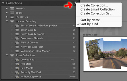 Create Collections, Smart Collections or Collection Sets by clicking on the '+' sign here.
